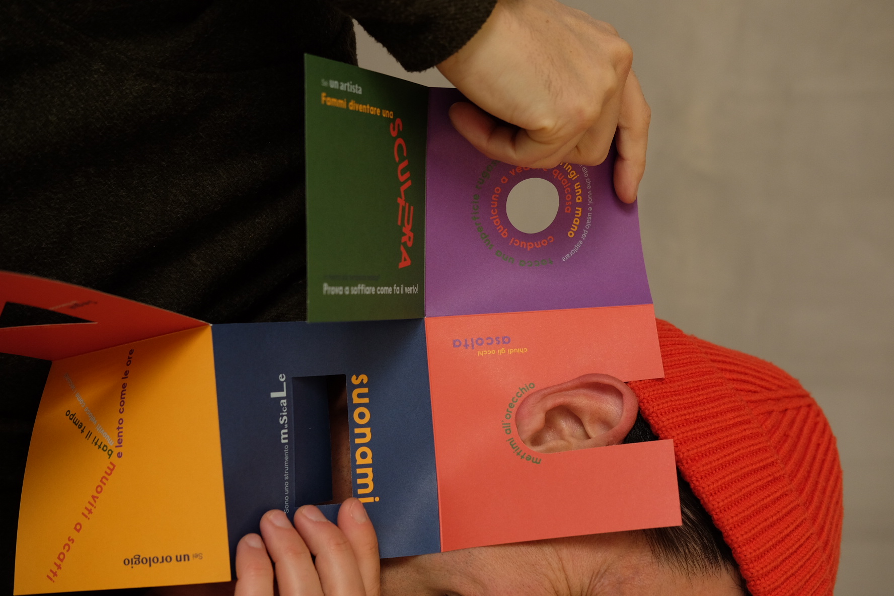 The activity book itself is not realized as a classic book, it doesn’t have a precise page order to follow or any pencils and tool to use, other than your own body. You are invited to play with that, wear it, use it as speaker, or as a telescope, build a castle...